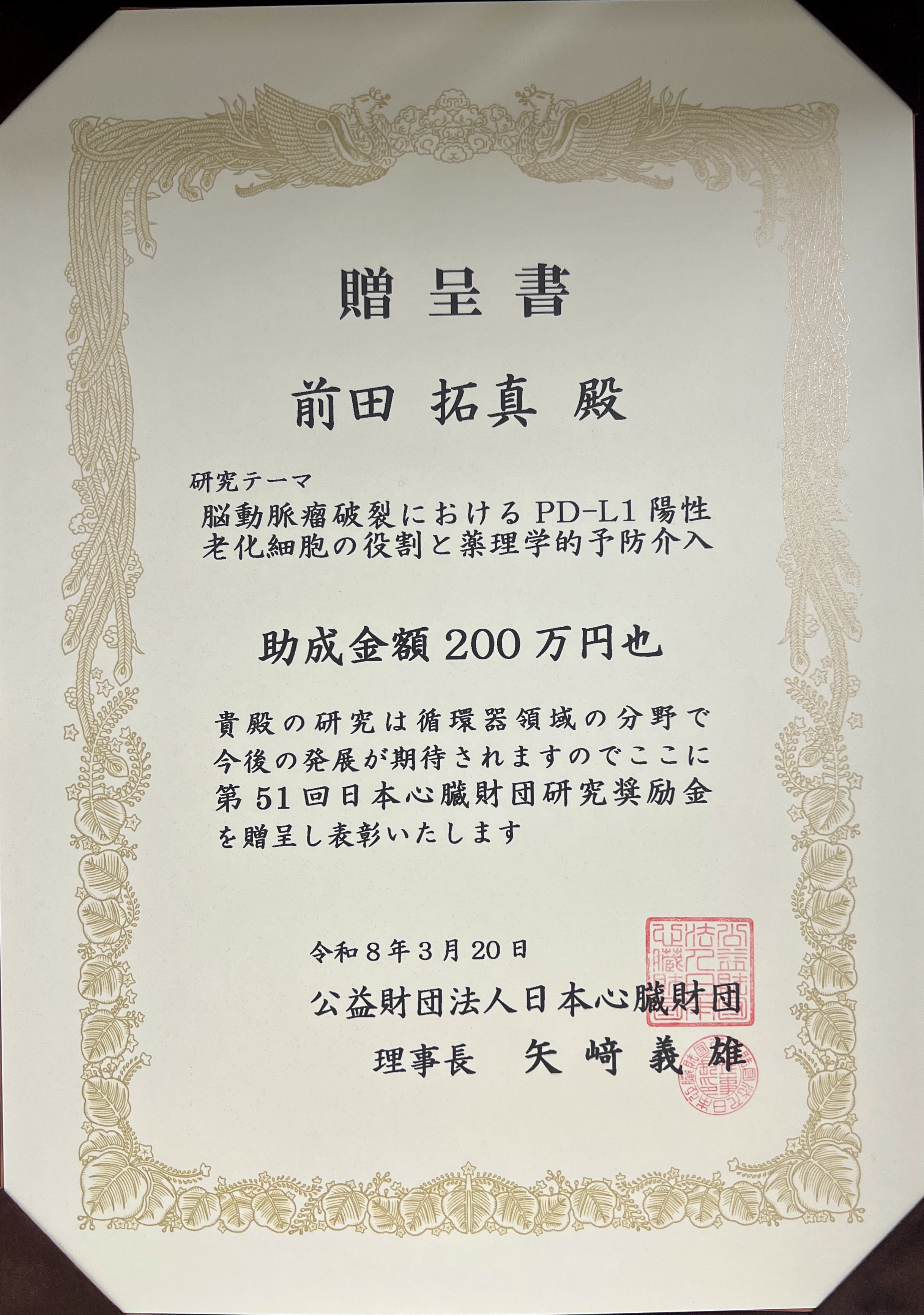 祝・脳卒中外科の前田拓真講師が、第51回日本心臓財団研究奨励を受賞しました。3月20日、日本循環器学会学術集会(福岡国際会議場)にて贈呈式が予定されています。