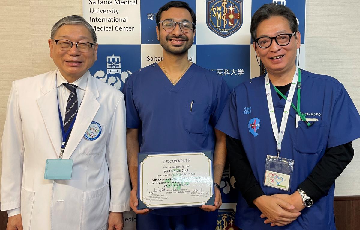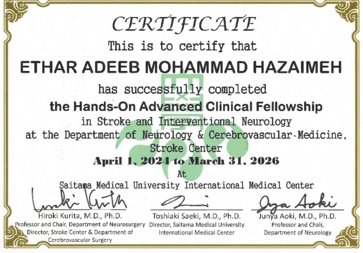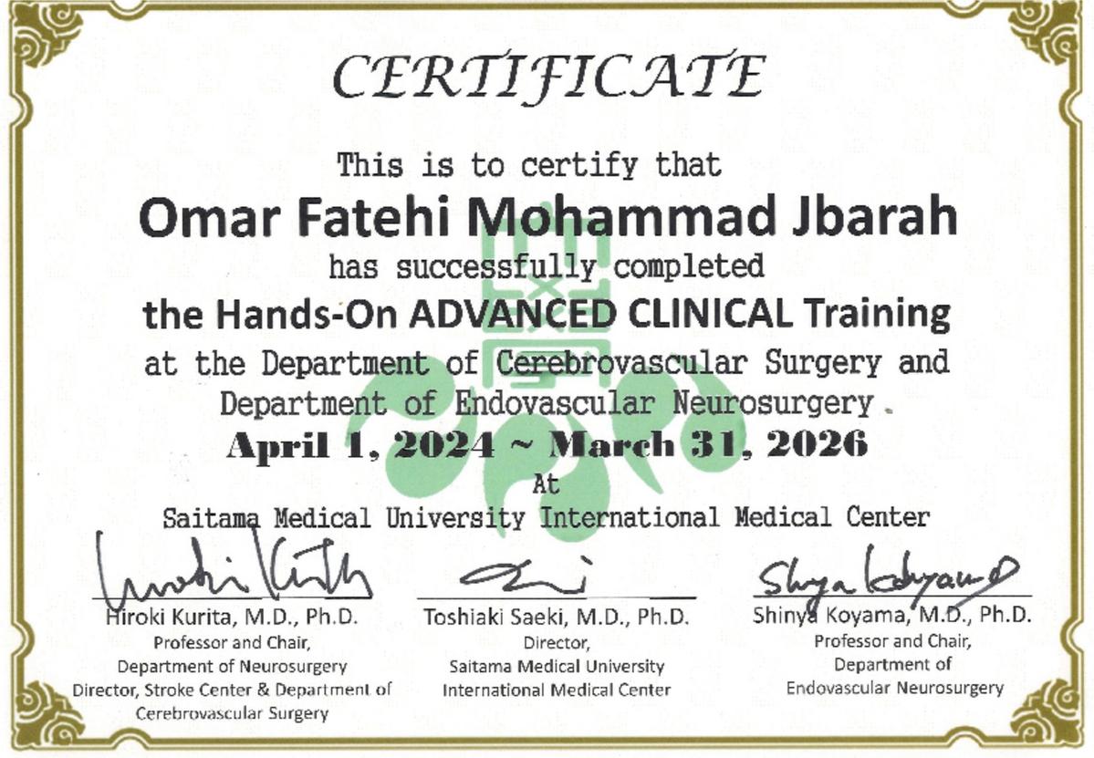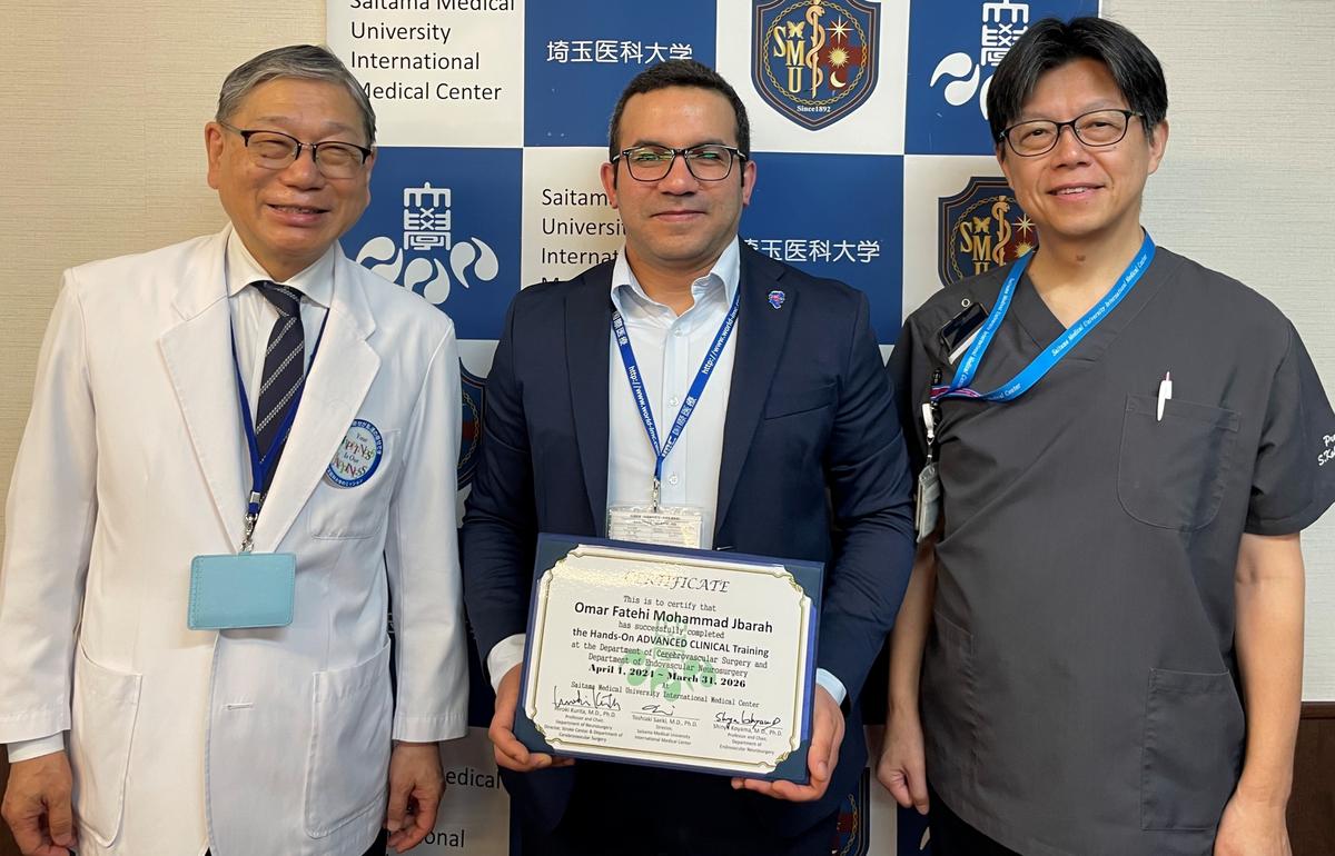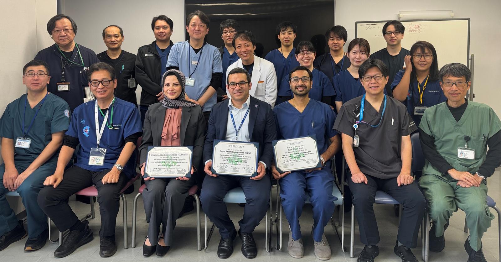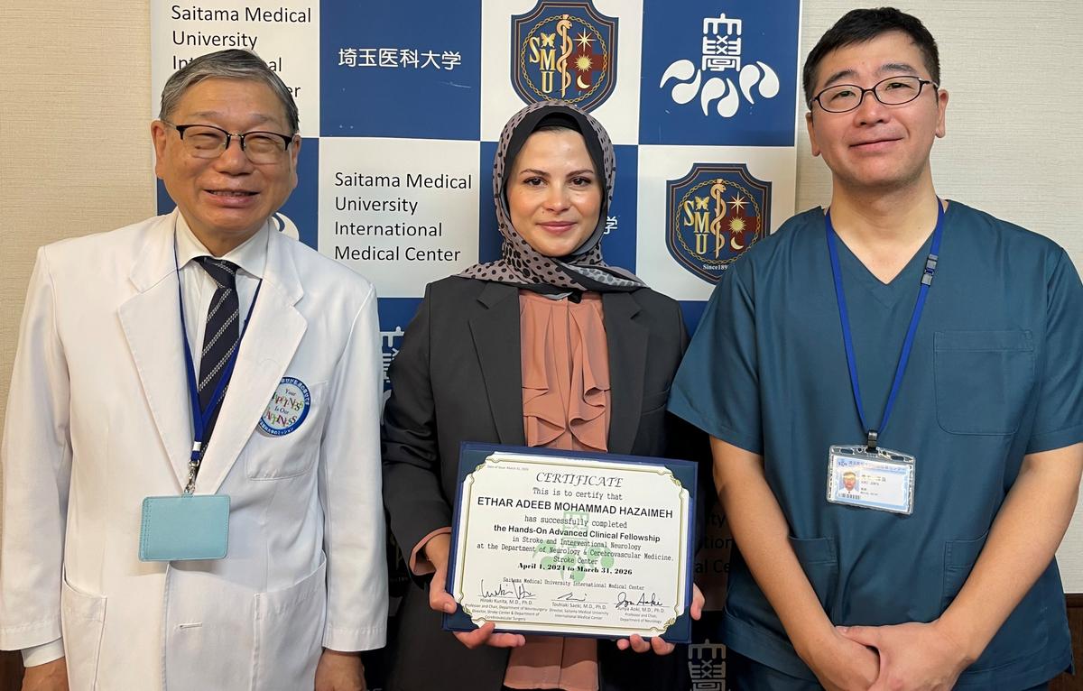 祝・Omar Fatehi Mohammad Jbarar先生(2年間:脳卒中外科及び脳血管内治療科)、Ethar Adeeb Mohammad Hazaimeh先生(2年間:脳卒中内科)、Sarit Pravin Shar先生(1年間:脳卒中外科)が当院脳卒中センターでの臨床修練を無事終了し、Certificateが佐伯病院長、各科診療部長より手渡されました。4月からは母国での活躍に期待したいと思います。